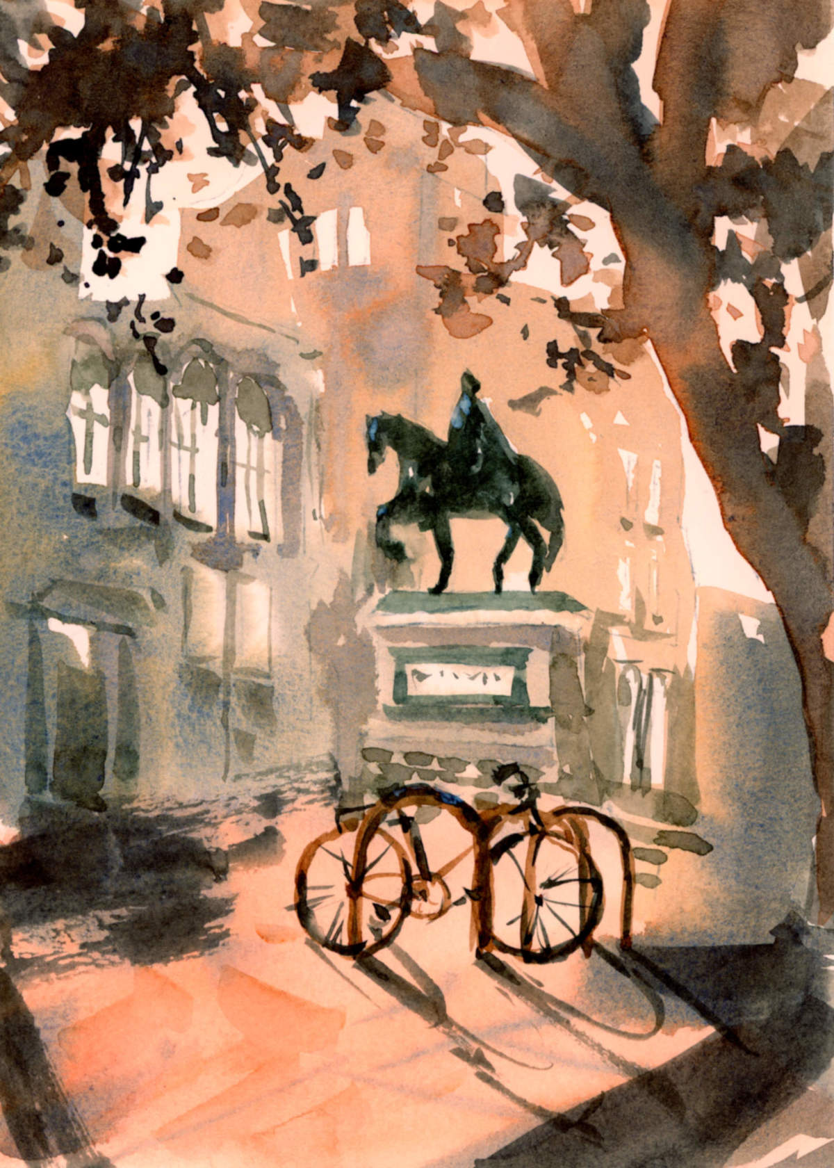 Celebrate the beauty of a fleeting moment with this atmospheric digital watercolour print. The scene captures the glow of the setting sun as it floods a quiet city square, bathing bronze statues, bicycles, and tree-lined streets in warm, golden light.